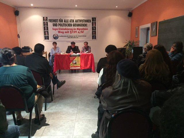 Panele konuşmacı olarak Avukat Gabriele Heinecke ve ATİK temsilcisi Metin Çiçekkatıldı. İlk söz hakkı alan Metin Çiçek operasyonun gelişimine kısaca değindikten sonra, bunun politik nedenleri üzerine görüşlerini belirtti. Türk devletiyle Alman devletinin tüm çelişkilerine rağmen devrimciler söz konusu olunca nasılda pervasızca ortak hareket edebildikleri belirtikten sonra, Alman devletinin Türkiye Kürdistanı ve Rojova’da özellikle Kürt güçleriyle Türkiyeli devrimcilerin geliştirdikleri birlikte hareket tarzına darbe vurmak, bununla birlikte devrimci ve göçmen mücadelesi yürüten kesimlerde bir moral bozukluğu yaratmak amaçlı bu operasyonu gerçekleştirdiğini anlattı.
