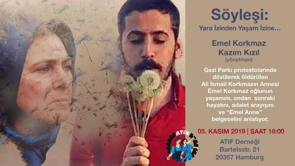 Hamburg|06.11.2019| ATİF Hamburg tarafından düzenlenen “ Yara İzinden , Yaşam İzine“ söyleyişisi Gezi direnişinde ölümsüzleşen Ali İsmail Korkmaz’ın annesi Emel Korkmaz ve Emel Anne belgeseli yönetmeni Kazım Kızıl’ın katılımıyla gerçekleştirildi. Hamburg’ta düzenlenen Kürt Film Festivalinde 06.11 bugün seyircisiyle buluşacak olan film öncesinde ATİF Hamburg dernek lokalinde düzenlenen etkinlikte bir araya gelindi.