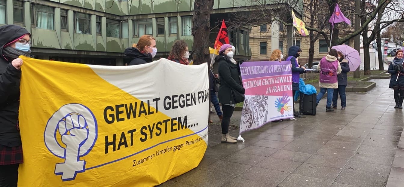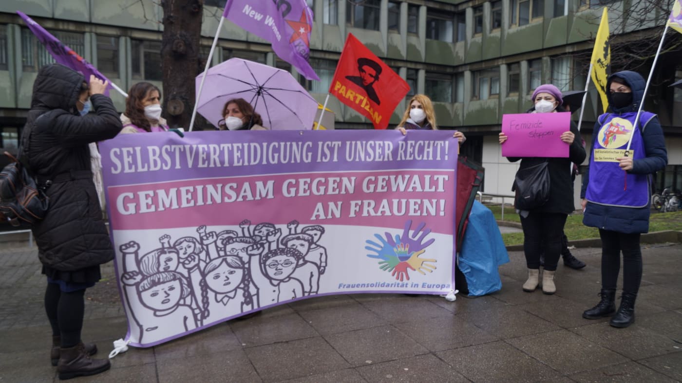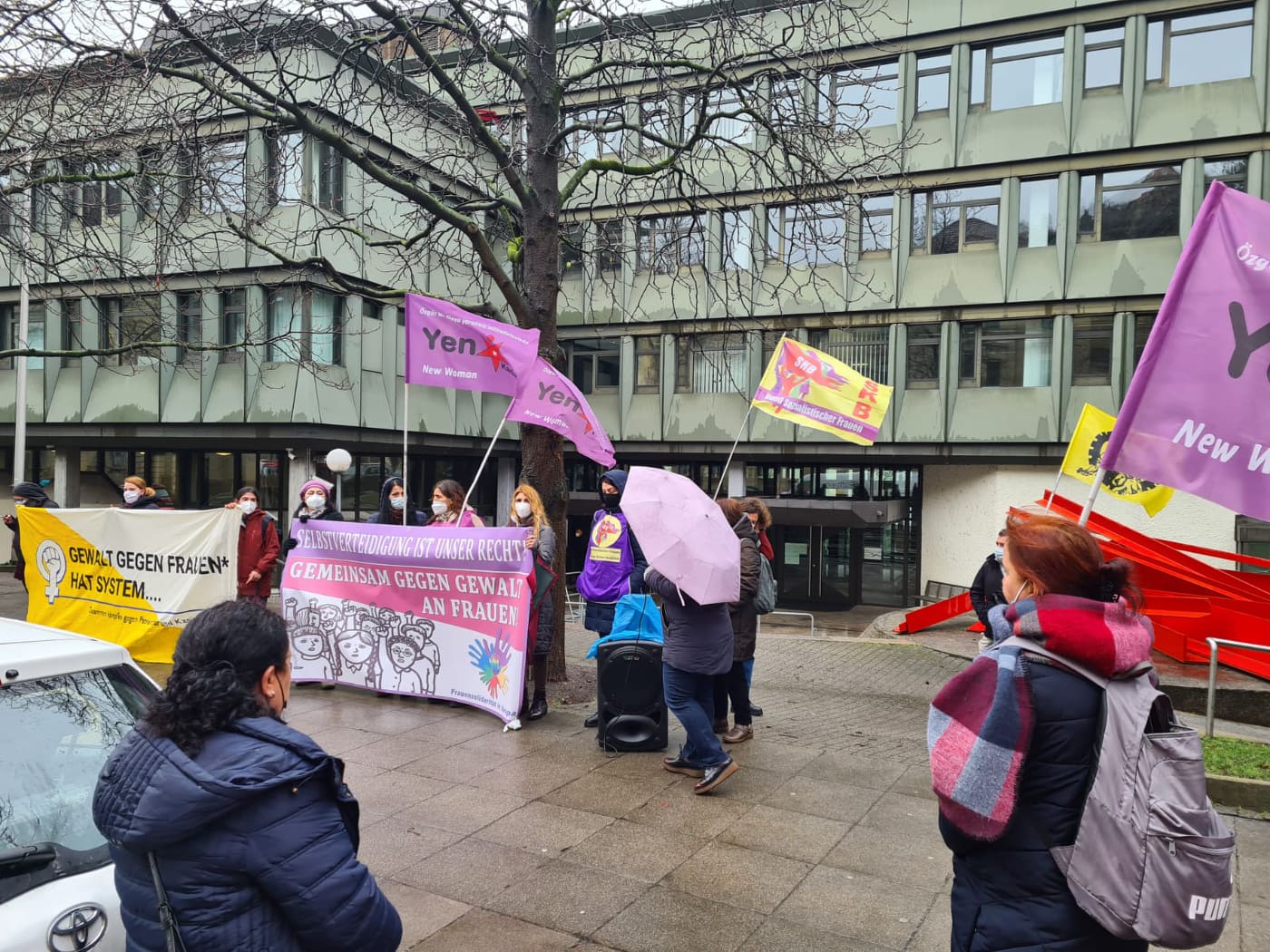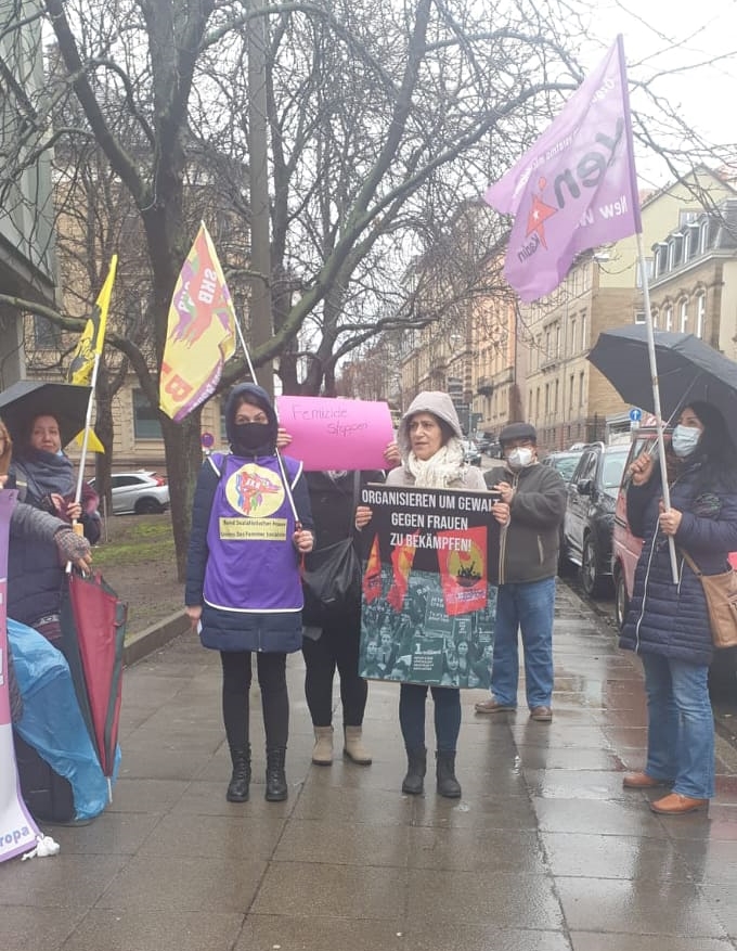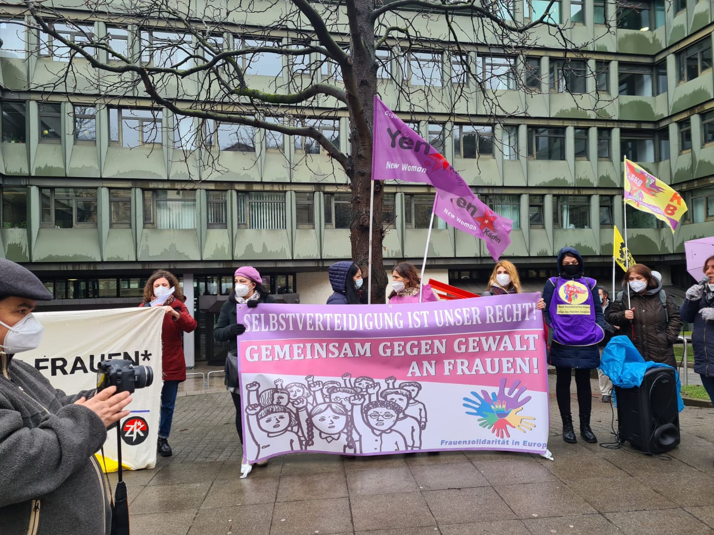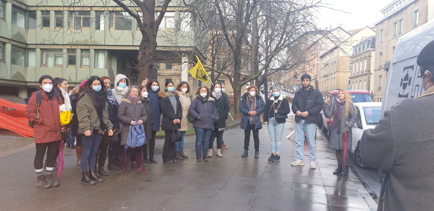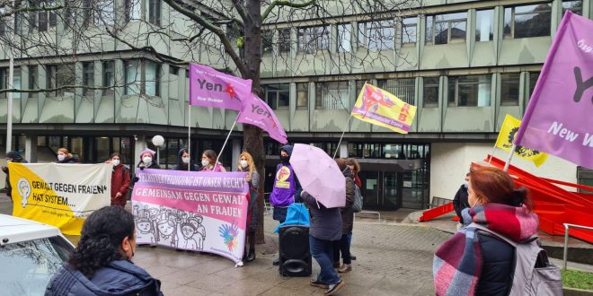 Kadınlar Alye İçin Adalet İstediler; Duruşmadan önce, mahkeme binası önünde Yeni Kadın’ın da bileşeni olduğu Avrupa Kadın Dayanışması, die Linke, Zusammen Kämpfen bir miting ve basın açıklaması gerçekleştirdiler. Kalabalık bir kadın kitlesinin katıldığı miting, AKD adına yapılan açıklamayla başladı. Yapılan açıklamada özetle; “Alyhe Shojaye 7 ay önce Stuttgart’ta sokak ortasında eşi tarafından öldürüldü. Alyhe Shojaye, her gün şiddet ve öldürülme tehlikesiyle yüz yüze bırakılan birçok kadından biriydi. Hâlâ sürmekte olan pandemiyle yeniden artan ev içi şiddet ve bunu önlemeye yönelik danışma, koruma olanaklarının yeterli olmadığı ortada. Almanya’da da her gün kadınların şiddete maruz kaldığına ve katledildiğine tanık oluyoruz. Bundan dolayı aile bakanlığından talebimiz; İstanbul Sözleşmesi’nin derhal hayata geçirilmesidir” dediler. Konuşmalarının devamında, “Bizler Alyhe ve katledilen bütün kadınlar için adalet istiyoruz. Biz kadınlar, Alyhe’nin katili için verilebilecek en ağır cezanın verilmesini istiyoruz. Talebimiz katil zanlısının ömür boyu hapis cezasına çarptırılmasıdır.” şeklinde sözlerini sürdürdüler…
