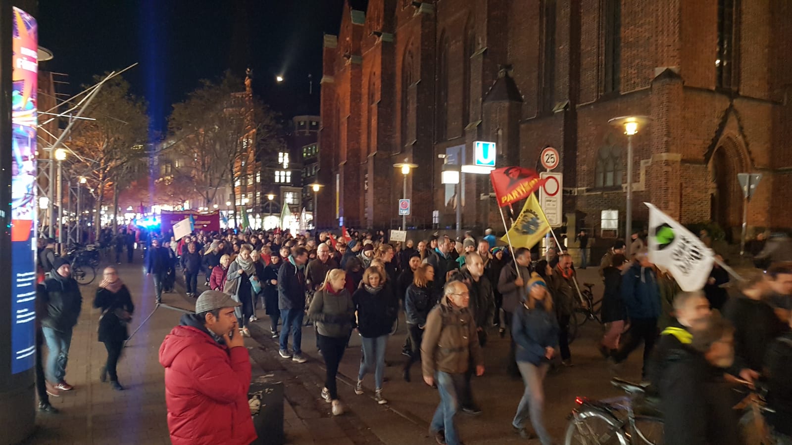 Dün (07.11) düzenlenen AfD eylemine karşı anti-faşistler Merkezi Tren İstasyonu (HBF)’nda saat 17:30’da bir araya gelerek ırkçılığa karşı yürüdü. Saat 18’de başlayan yürüyüş Dammtor semtine doğru ilerledi. Dammtor semtinde bulunan meydanda sayıları çok az olan bir grup AfD taraftarı polis koruması altında miting yapmaya çalıştı. Anti-faşistlerin düzenlediği karşı eylemde binlerce kişi katılarak AfD’yi protesto etti. Anti-faşist potansiyelin olduğu Hamburg’ta Dammtor alanına gelen AfD karşıtları anti-faşistler orada da AfD’nin eylemini sloganlarla , ıslıklar ve çeşitli aktivitelerle bastırdı. Eyleme ATİK , Partizan , ADHK , Haziran vb. göçmen örgütleri yanı sıra çeşitli yerli anti-faşist inisiyatifler ve kurumlar katıldı.