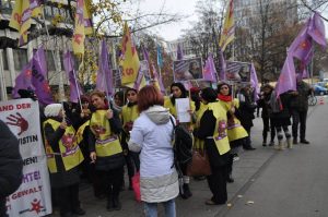 25 Kasım Yeni Kadın MYK’sının çağrısıyla bir araya gelen Yeni Kadın Almanya, Avusturya, İsvicre bileşenleri kitlesel katılımla Derimcilerin yargılandığı Mahkeme önünde buluştular. Yeni Kadin’ ın organize ettiği ve SKB (Sosyalist Kadınlar Birliği),Courage ve MLPD’den kadın yoldaşlarımızın da Dr.Banu Büyükavcı şahsında tüm Devrimci tutsak yoldaşlarımızı sahiplendikleri mitinge Van HDP milletvekili Tuğba Hezer’de katılarak bir konuşma yaptı.